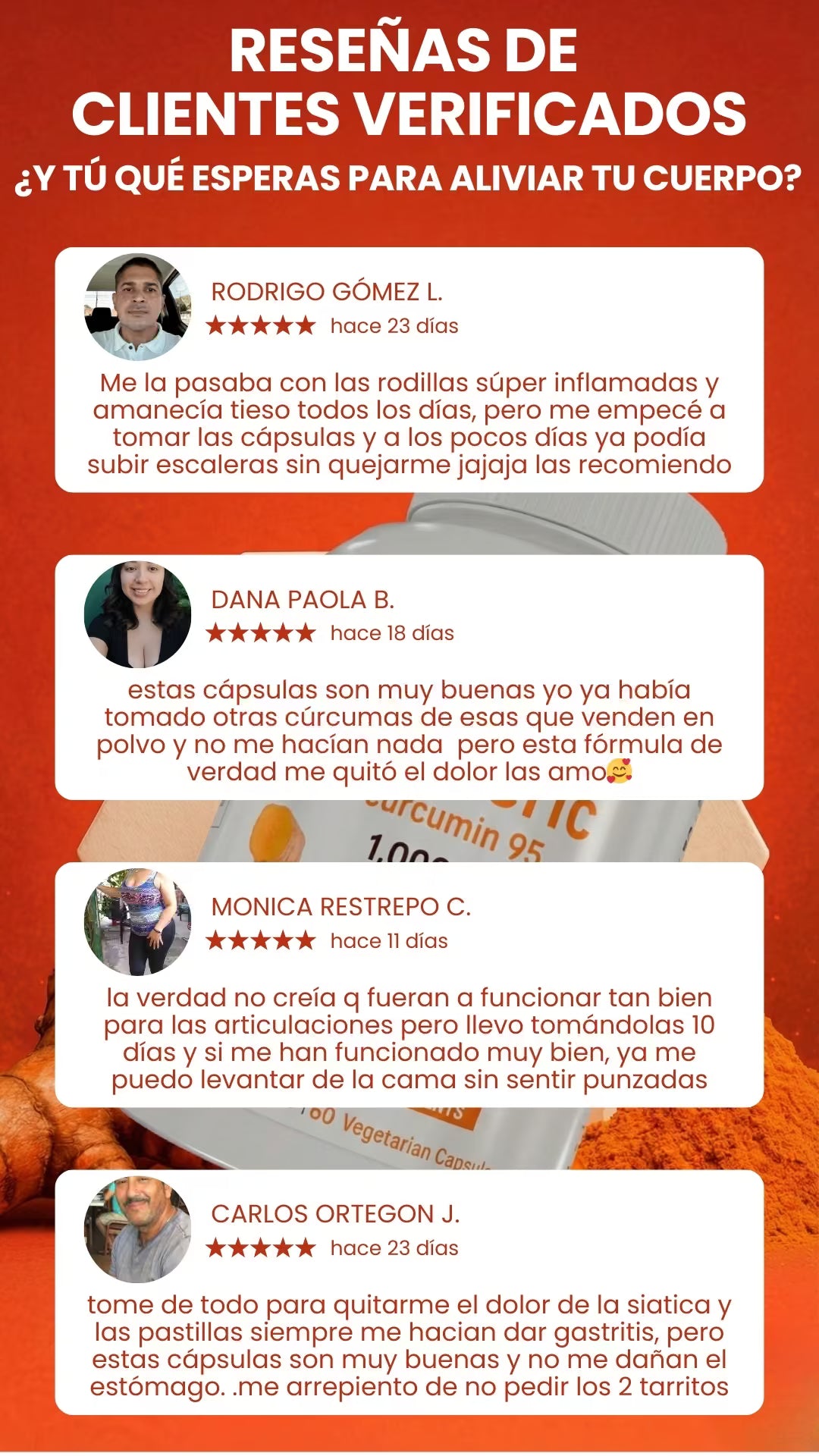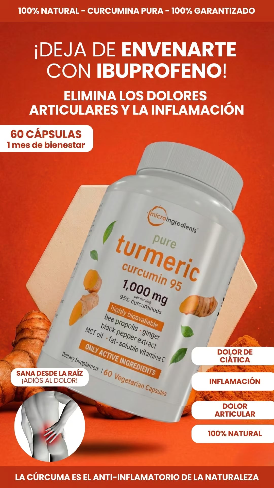 Descubre cómo nuestro Complejo de Cúrcuma apaga la inflamación, combate el bloqueo articular y te devuelve la movilidad desde la primera semana.